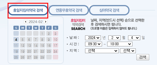 설날, 추석과 같은 명절연휴 및 법정공휴일에 운영하는 약국을 확인하는 방법은 아래와 같이 "휴일지킴이약국 검색"을 통해 원하는 날짜와 시간을 선택하고 지역명을 입력하여 검색하면 휴일 문 여는 약국을 찾을 수 있습니다.