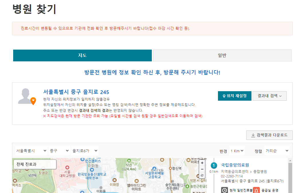 명절 연휴, 휴일에 문 여는 병원은 응급의료포털 사이트를 통해서도 확인할 수 있는데요, 내 위치를 설정하여 주변에 위치한 응급실 정보, 병원 정보를 알 수 있습니다. 아래 보시는 바와 같이 지도를 통해서 확인할 수도, 도로명 주소를 통해서 확인할 수도 있습니다.