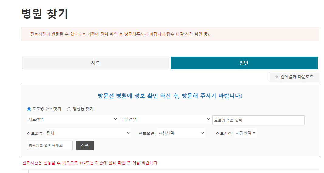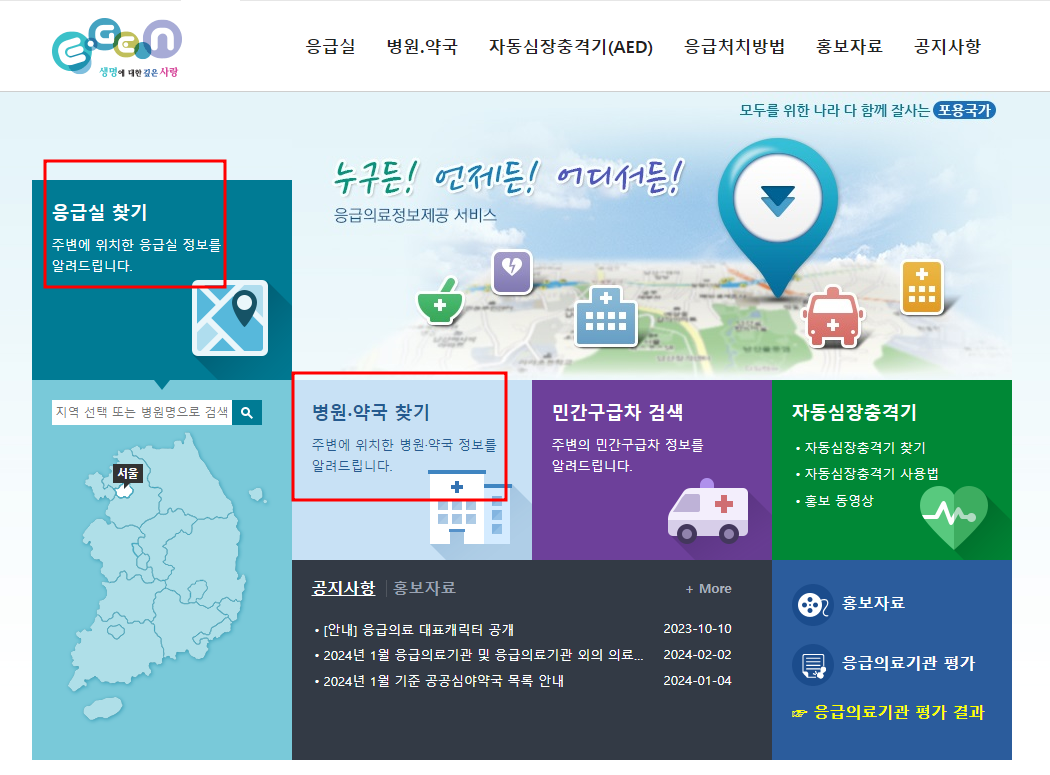 휴일 문 여는 병원 찾기 - 응급의료포털 사이트
